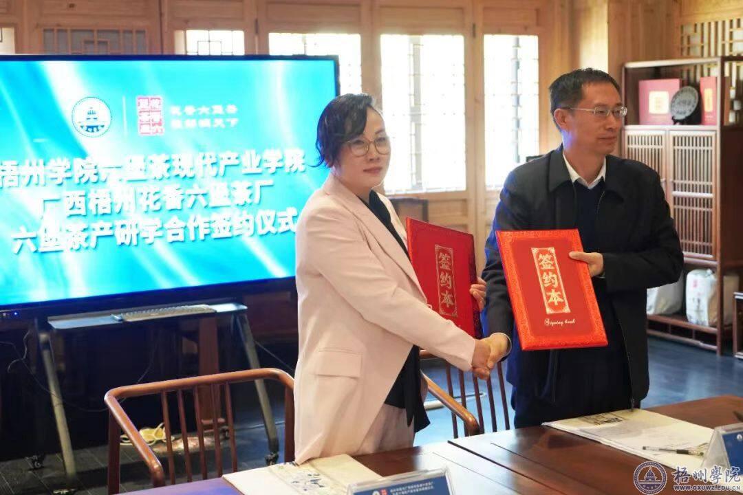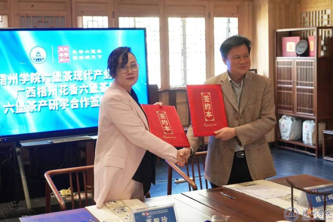 广西梧州花香六堡茶厂创始人高敏玲与梧州学院食药学院院长陈金辉进行签约。