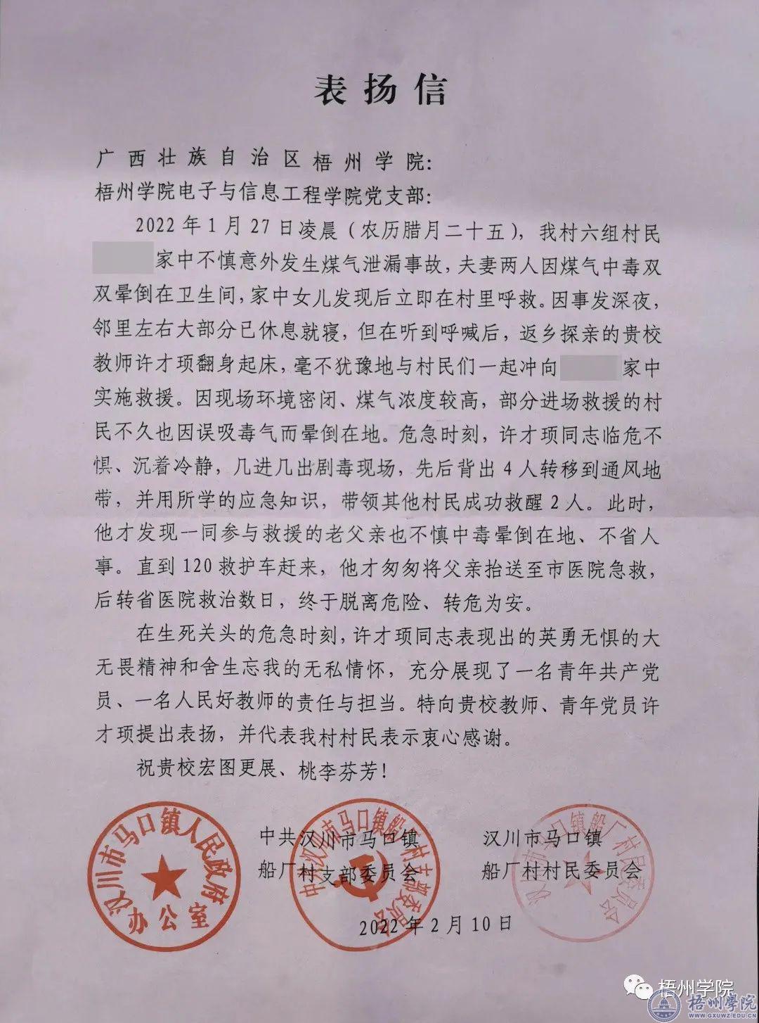 信中的主人公许才顼是梧州学院电子与信息工程学院(以下简称“电信学院”)的青年党员教师。在邻居煤气中毒命悬一线时,他见义勇为上演生死时速。