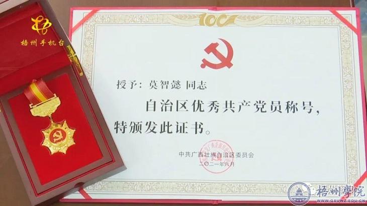 梅花香自苦寒来,每一个成功的背后都是莫智懿辛勤付出的汗水。他连续10年获得梧州学院科研先进个人,获得梧州市科技进步奖一等奖1项,并在2019-2020年度获得梧州市脱贫攻坚“先进个人”称号,2021年先后获得自治区优秀共产党员称号和梧州五一劳动奖章。今年4月,莫智懿积极响应梧州学院党委的号召,报名担任2021年新一轮脱贫攻坚(乡村振兴)工作队队长,并即将到蒙山县投身到乡村振兴事业一线。他敢为人先,敢于担当,用实际行动践行了一名共产党人的初心和使命。