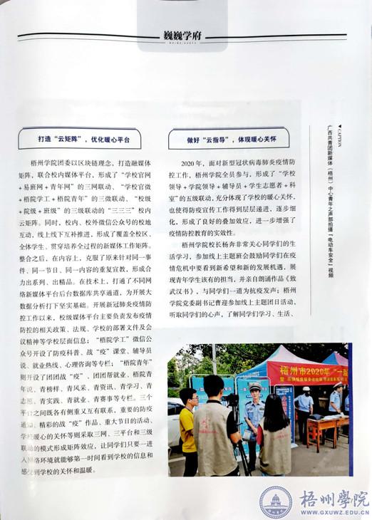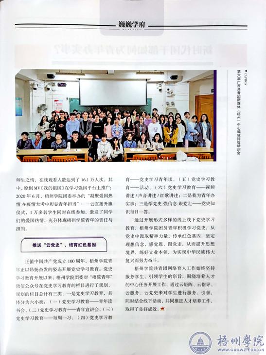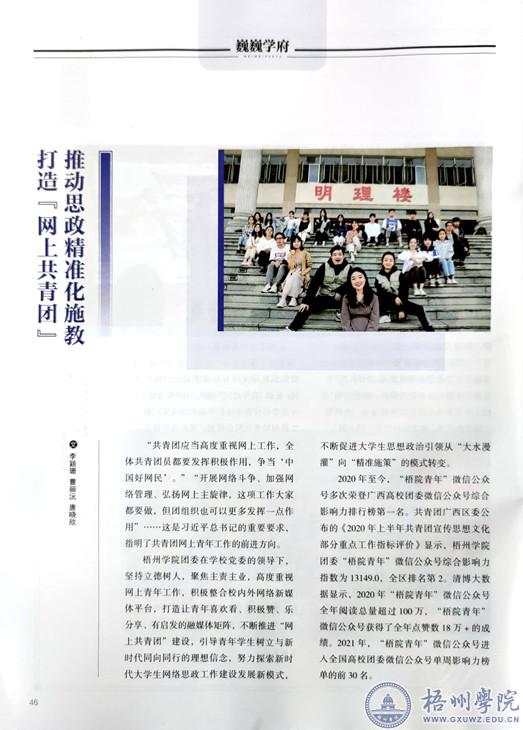 2021年6月,由共青团广西区委主管的共青团广西区委《金色年华》总第637期杂志的“巍巍学府”一栏,以《打造“网上共青团” 推动思政精准化施教》一文,报道了我校以立德树人为根本任务,以打造“网上共青团”为契机,以网络新媒体平台为依托,精准化实施青年学生思想政治教育的模式探索和不断筑牢青年思想根基的实践工作成果。
