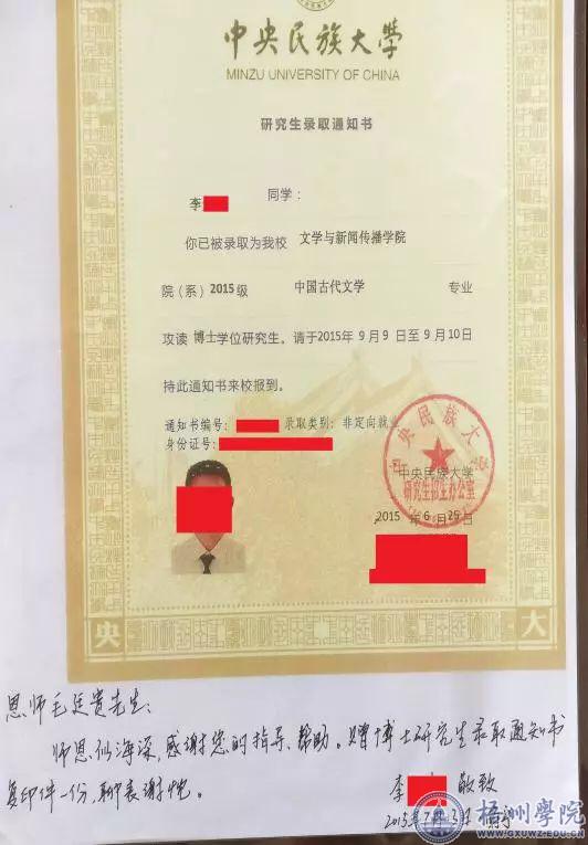 为感谢师恩,小李把自己的博士研究生录取通知书复印件寄给了毛廷贵