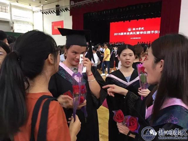 上午8点半,随着雄壮的国歌声响起,梧州学院2018届毕业典礼暨学位授予仪式拉开帷幕。在师生代表发言过后,学校领导为区级优秀毕业生、学校优秀毕业生颁发了荣誉证书和奖金,以及给考取硕士研究生的毕业生发放奖金,并为台上的学生代表颁发毕业证和学位证。随后,学校领导还为全体在校毕业生逐一拨穗正冠。同学们在一张张照片定格下记录青春中最美的瞬间,记录下老师、同学间彼此深厚的感情。面对即将告别的大学生活,许多同学表示虽然依依不舍,但是也要整装待发迎接全新的生活。