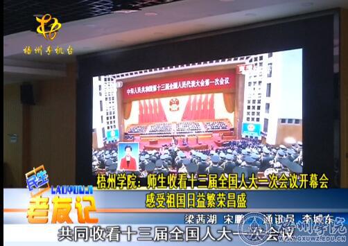 梧州电视台2018年3月5日《民生老友记》以“梧州学院:师生收看十三届全国人大一次会议开幕 感受祖国日益繁荣昌盛”为题对我校组织师生观看两会开幕式进行了报道。