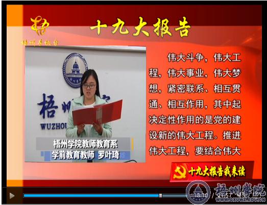 12月4日,在梧州电视台晚间新闻栏目播出的“十九大报告我来读”内容中,播送了我校纪委办公室主任、监察科科长黄立勇,经济管理学院物流管理专业教研室主任张晓磊,师范学院学前教育专业教师罗叶琦等积极参与诵读党的十九大报告内容。