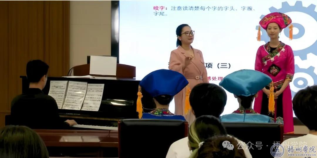 练远媚教师课程团队在《声乐》课程建设中针对不同年级实施差异化创新实践。面向大一学生(声乐Ⅱ)1对4小组课《广西民歌的演唱》,采用学生“3演唱者 + 1伴奏者”的主导协作模式,深度融入“民族团结”主题的思政教育,重构教学流程形成“演 + 讲 + 弹”整合型教学模式。面向大二学生(声乐Ⅲ)1对2小组课《古诗词歌曲的演唱》,实施学生“1唱 + 1弹”主导机制,围绕“中华优秀传统文化传承”思政目标,探索 “声乐主课 + 钢琴与歌曲伴奏课程”跨课程融合模式,整合人工智能(AI)技术赋能教学。通过“沉浸式教学”,该课程有效促进学生对音乐作品文化内涵的理解和艺术表现力的提升,实现了课程的高阶性目标。