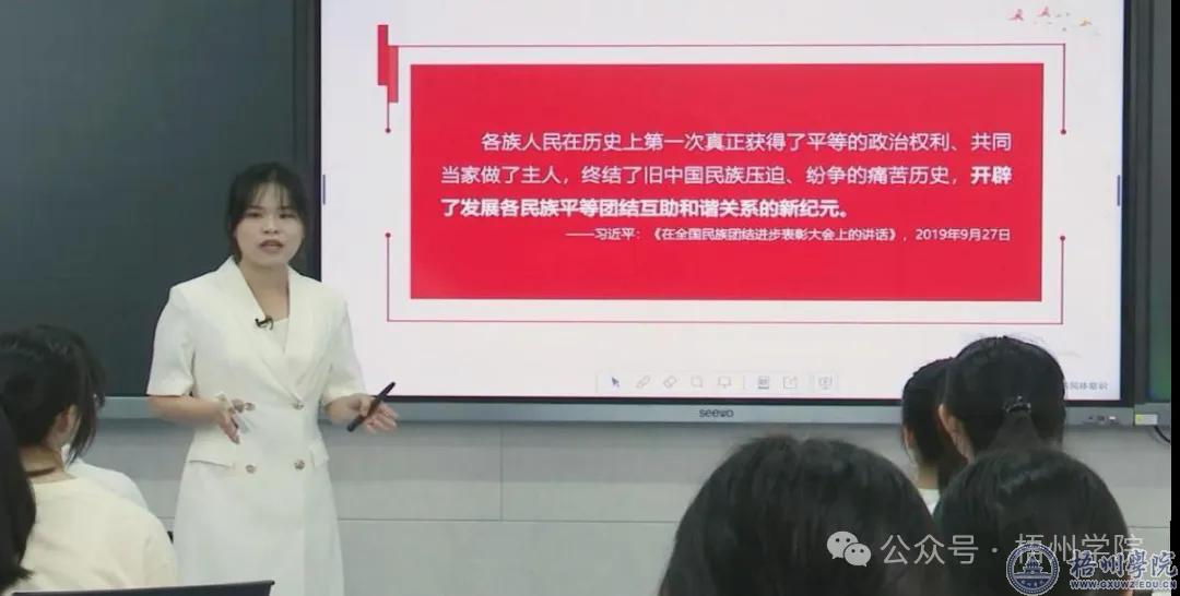 程美慧老师及课程团队的《铸牢中华民族共同体意识》课程聚焦解决“入脑难”困境,以广西非遗为钥,开启文化共鸣,让民族基因“活”起来。课堂中,六堡茶的千年茶韵化作“民族团结”的生动诠释,AI技术复原的铜鼓纹样解码出“多元一体”的历史密码。同时依托实践项目,让学生展示广西工程建设成就,用镜头记录下“石榴籽”盛景,用剪纸搭建出“五认同之花”。课程将思政课理论转化为可触摸的现实温度,课程创新实践的有效性,让学生在鲜活实践中更好地理解中华民族共同体意识。