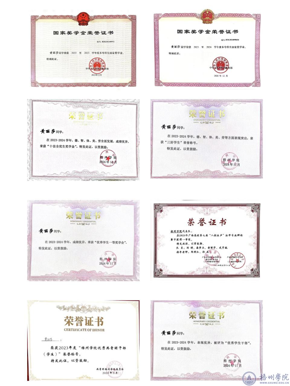 黄丽莎,法学院2021级法学1班,中共党员。在校期间,她曾获得国家奖学金、十佳全优生奖学金并荣获连续三年的梧州学院优秀学生一等奖学金和“三好学生”、“优秀学生干部”等荣誉称号。在校期间参加多项比赛活动,曾荣获广西高校第七届“八桂法声”法学专业辩论赛一等奖、梧州学院“第八届中国国际‘互联网+’大学生创新创业大赛”校赛金奖等奖项。