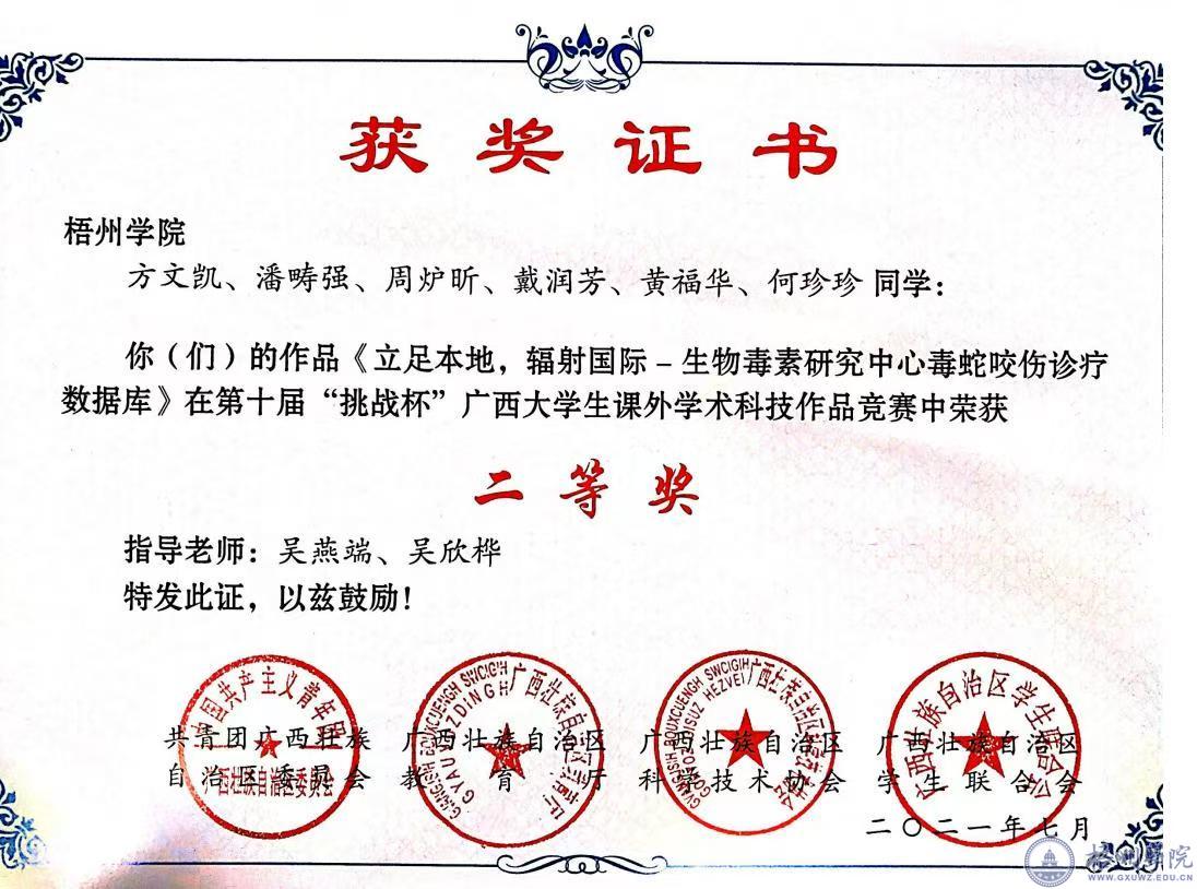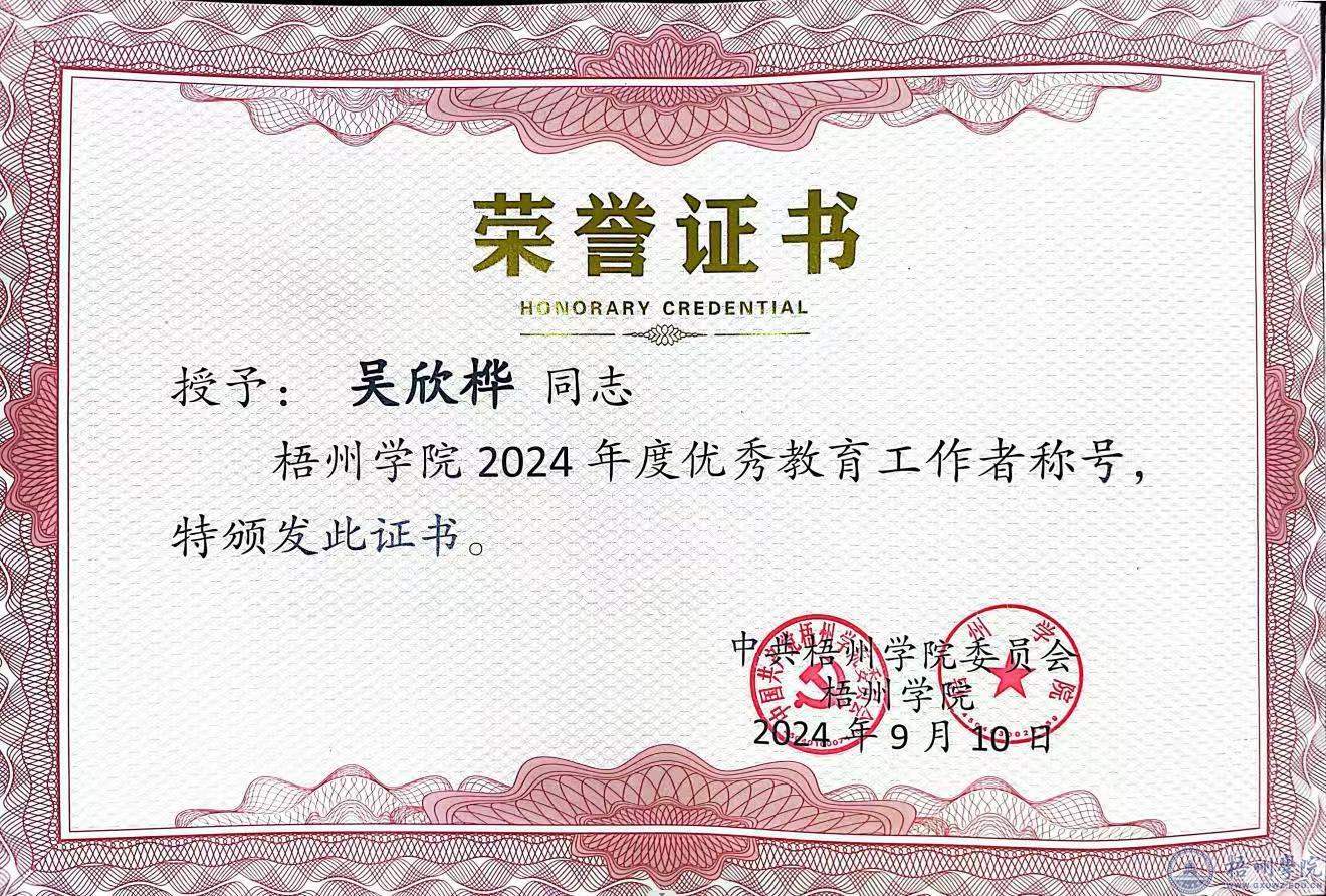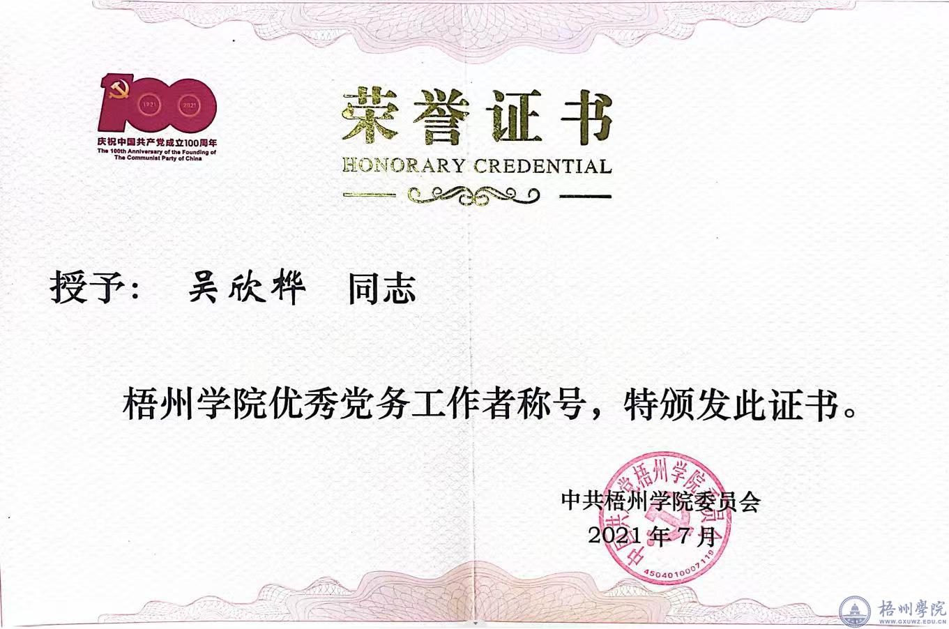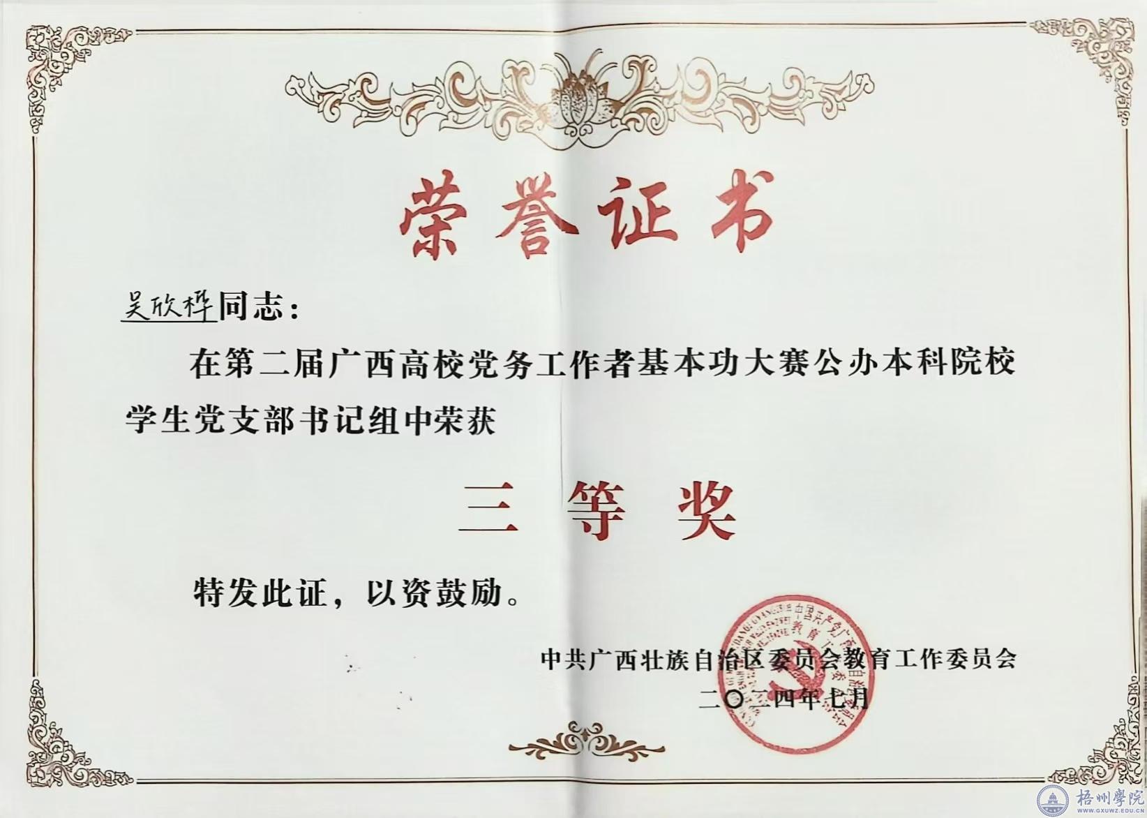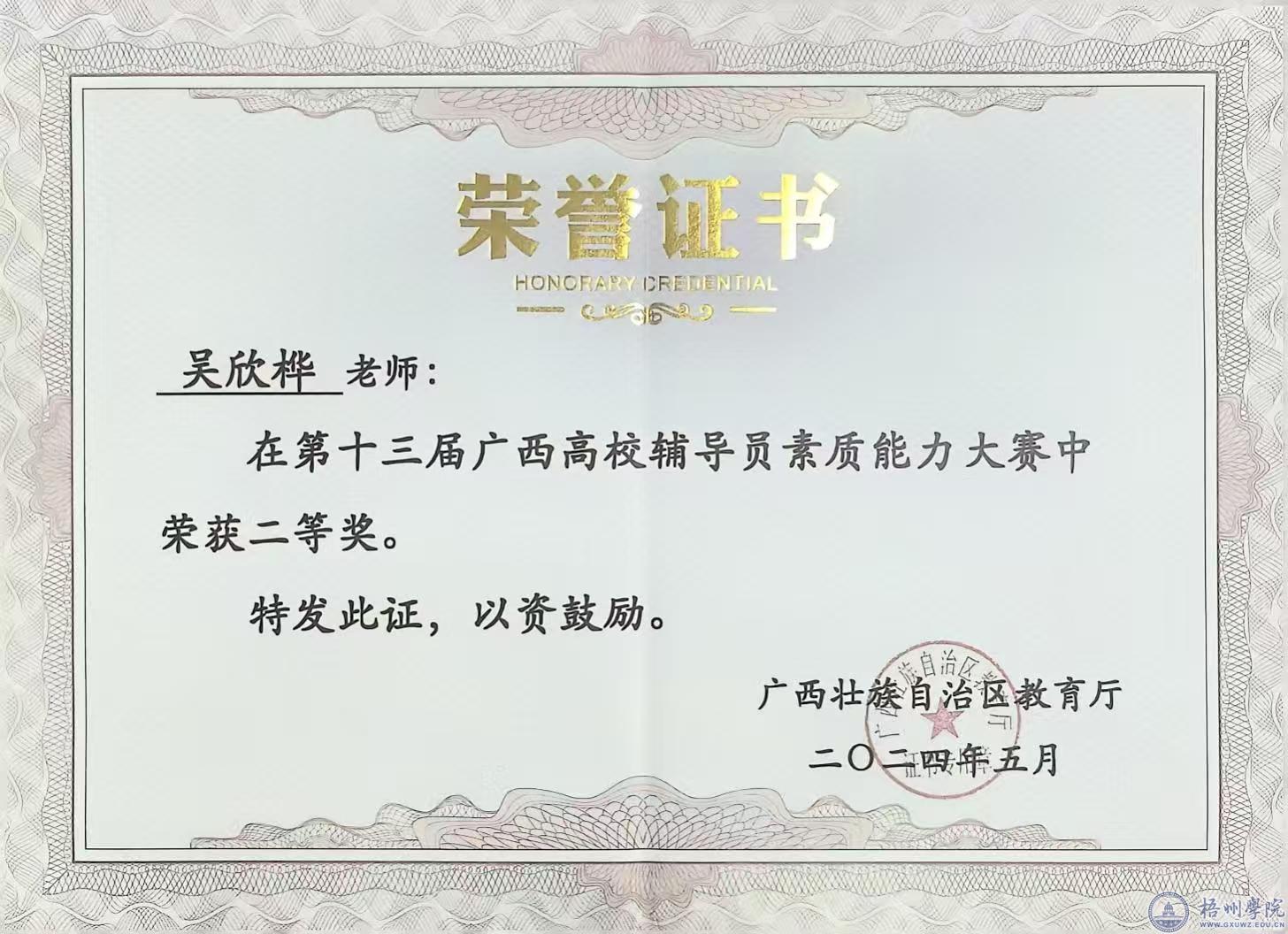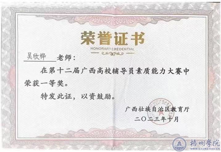 曾获广西高校辅导员素质能力大赛一等奖、二等奖,全区党务基本功大赛三等奖,校级优秀教育工作者、优秀党务工作者、优秀辅导员等各类奖项近30项,指导学生参加区内外比赛获奖10余项,荣获广西大学生人工智能设计大赛优秀指导老师称号。