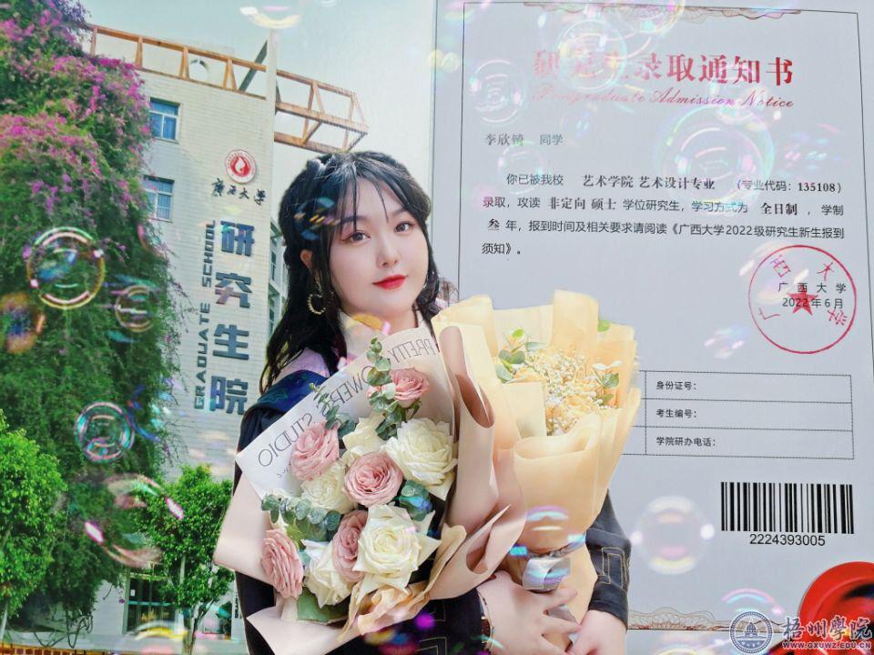 铅刀虽软,却不失磨砺成为锋利宝剑的志向;萤火虽弱,亦希望与日月之光肩并着肩。望前方,终会有温柔月光,今年的李欣锜成功考取广西大学的研究生。在未来,她希望可以学习更多的专业知识、发表自己署名的论文期刊,在成就自我的道路上穿花寻路,直入白云深处。