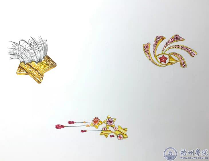程学睿始终认为工匠精神应该是忘我的、一丝不苟的。从昔日,到今时,匠人总是这样——他们双肩担道义,责任放心底。在传承工艺的路上,程学睿既是学生,也是匠人。在大四的一次课程作业里,她用五角星与流星的结合,完成作品《星火燎原》,来表达对祖国深沉的爱与祝愿。其中作品包括吊坠、戒指和胸针。旋转式的戒指,需要焊立成形并不容易,程学睿焊了数次,最终在底部加上金属粒才焊好,宝石周边金属粒的排布、颗粒大小的选择更是要精益求精。光滑亮丽的成品背后,是程学睿孜孜不倦的一次又一次的抛光。“工匠”信念藏在日复一日的打铁里,藏在双手的一道道伤痕里,藏在越来越厚的画稿里……她始终思考着如何把创新与传承相结合的问题。她认为在保留传统文化的基础上,应做到材质创新、颜色创新、理念创新、造型创新,思维不是固化的,材质的创新可以让人们选择性比价更高的产品,颜色、造型、理念上的创新既贴近大众审美,同时也符合时代追求。