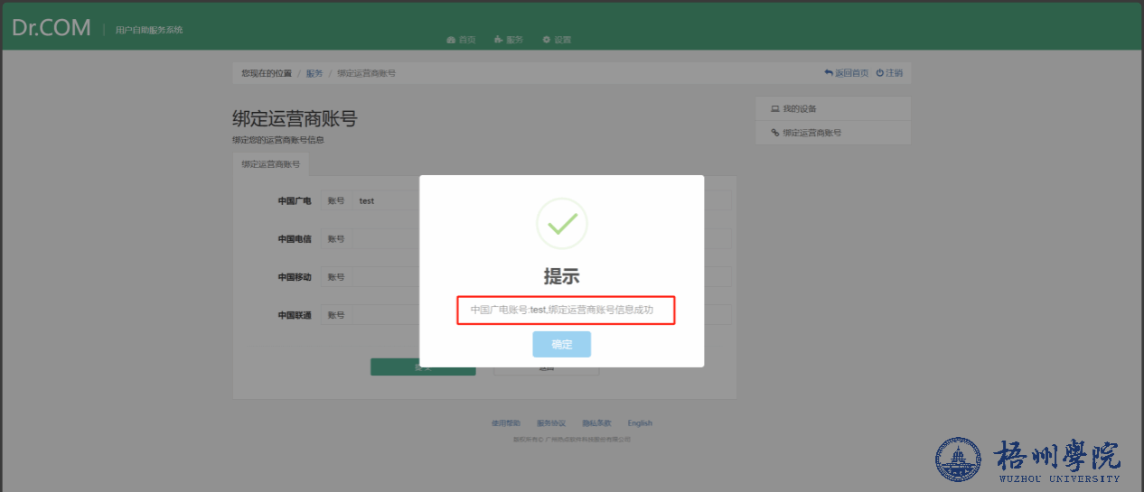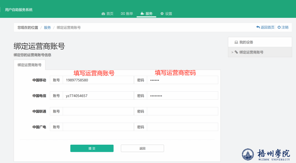 保存完毕后,关闭自服务页面,返回登录页面登录,输入统一身份认证学号和密码后,选择相对应的运营商,点击《登录》,即可完成登录。