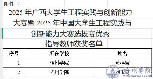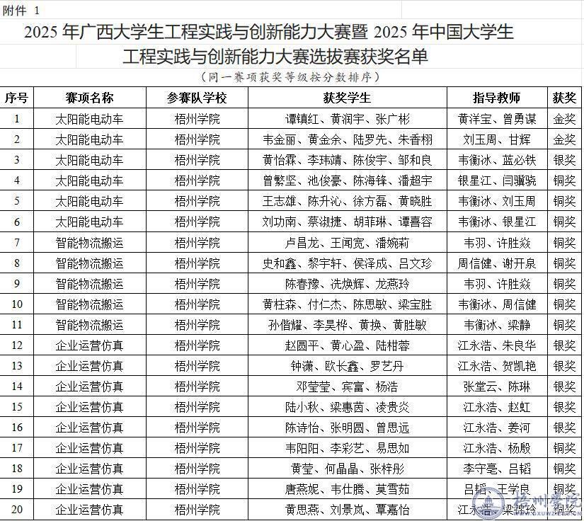 近日,在2025年广西大学生工程实践与创新能力大赛暨2025年中国大学生工程实践与创新能力大赛中,我校参赛队表现出色,为学校争得荣誉:荣获太阳能电动车赛项金奖2项、银奖1项、铜奖2项;智能物流搬运赛项铜奖5项;企业运营仿真赛项银奖5项、铜奖4项;黄洋宝、刘玉周获优秀指导教师奖。