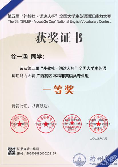 其中,24国际经济与贸易2班韦仁壮同学以全区第3名的优异成绩荣获区赛特等奖;21汉语言文学1班徐一涵同学和22小学教育1班辛欣同学分别位列全区第20名和第52名,荣获区赛一等奖。这三位同学成功晋级全国总决赛,是我校在该项赛事中实现新的突破。