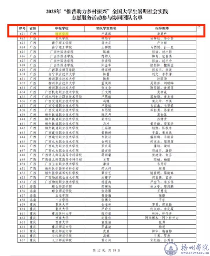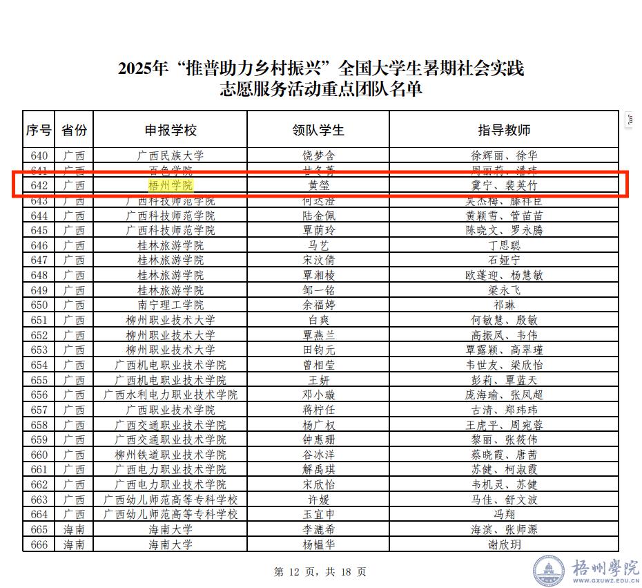 近日,教育部发布了《2025年“推普助力乡村振兴”全国大学生社会实践志愿服务活动入选名单》。其中,梧州学院“红语润乡 茶马知行”实践团(第7队)和梧州学院“推普+文艺乡村”服务团(第3队)分别入选国家重点团队和参与协同团队。
