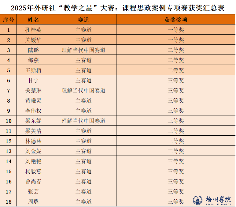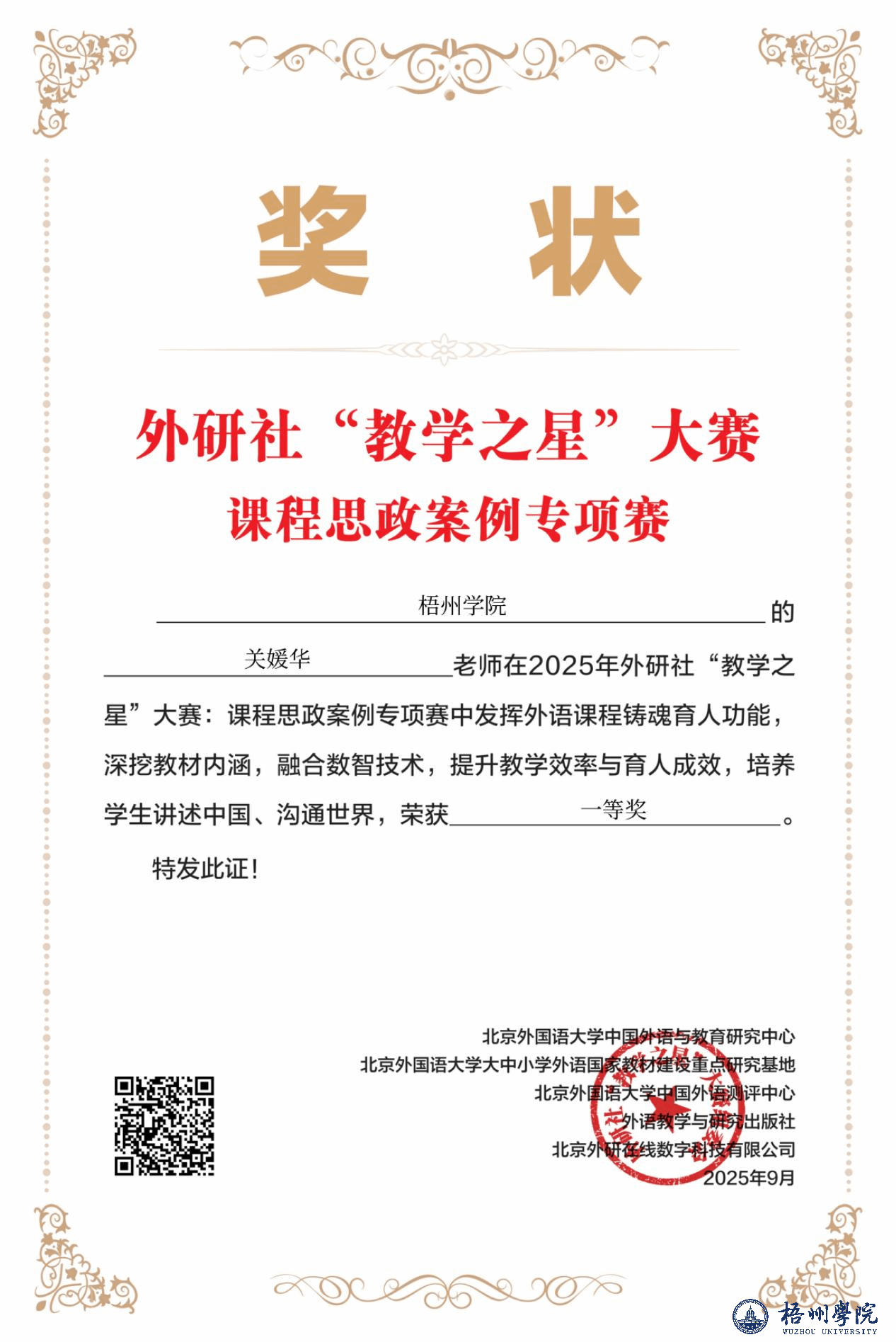 9月10日,2025年外研社“教学之星”大赛课程思政案例专项赛结果揭晓,外国语学院共有18位教师获国家级奖项。其中,孔桂英、关媛华荣获一等奖;陆璐、邹燕、王斯榕荣获二等奖;甘宁、关楚琳、黄曦灵、李伟权、梁东妮、梁美清、林德慈、刘金妮、刘艳艳、杨毅燕、曾尚春、张芸、周璐等13位教师荣获三等奖,彰显了我院教师在教学设计与课堂实践中的创新能力与专业水平。