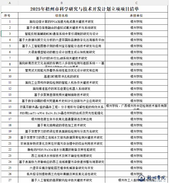 近日,梧州市科技局发布《关于公布2025年梧州市科学研究与技术开发计划项目立项名单的通知》,我校《面向边缘计算的FPGA加速光电成像关键技术研发》等27个项目成功获批立项。