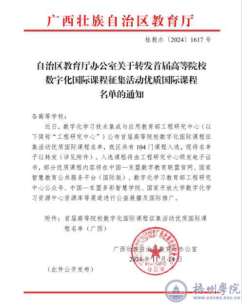 首届高等院校数字化国际课程征集活动优质国际课程是积极响应国家教育数字化战略行动集成化、智能化、国际化要求,进一步落实第三届中国一东盟教育部长圆桌会议成果文件精神,推进优质教育资源跨境共建共享的重要举措。