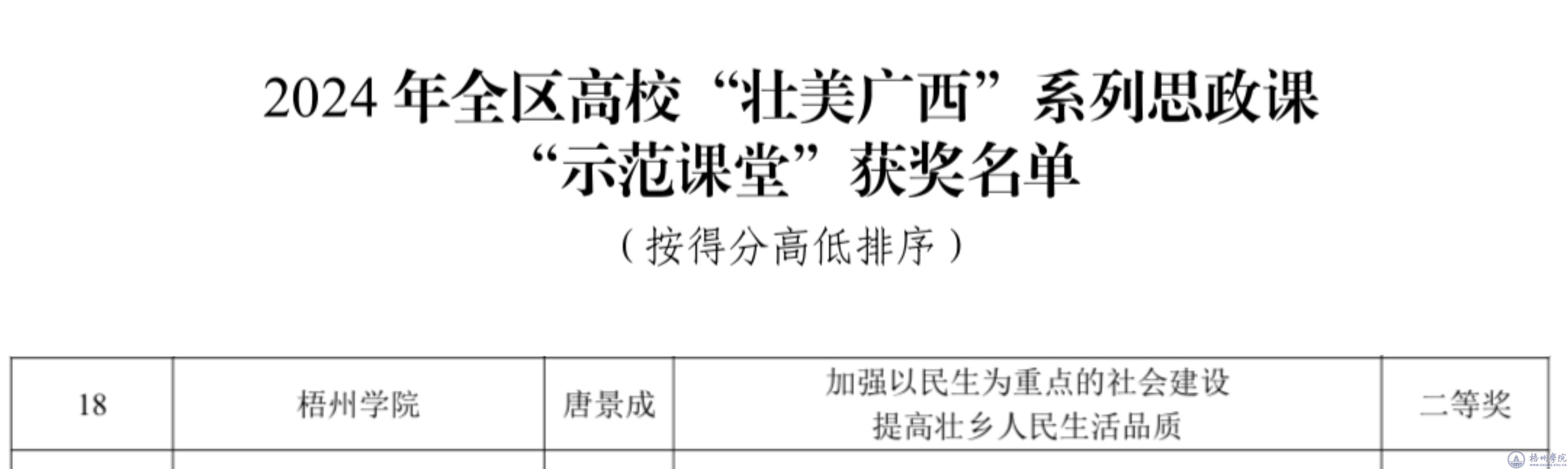 近日,2024年全区高校“壮美广西”系列思政课“示范课堂”获奖名单公布,马克思主义学院唐景成教授以“加强以民生为重点的社会建设 提高壮乡人民生活品质”为主题的示范课堂荣获二等奖。