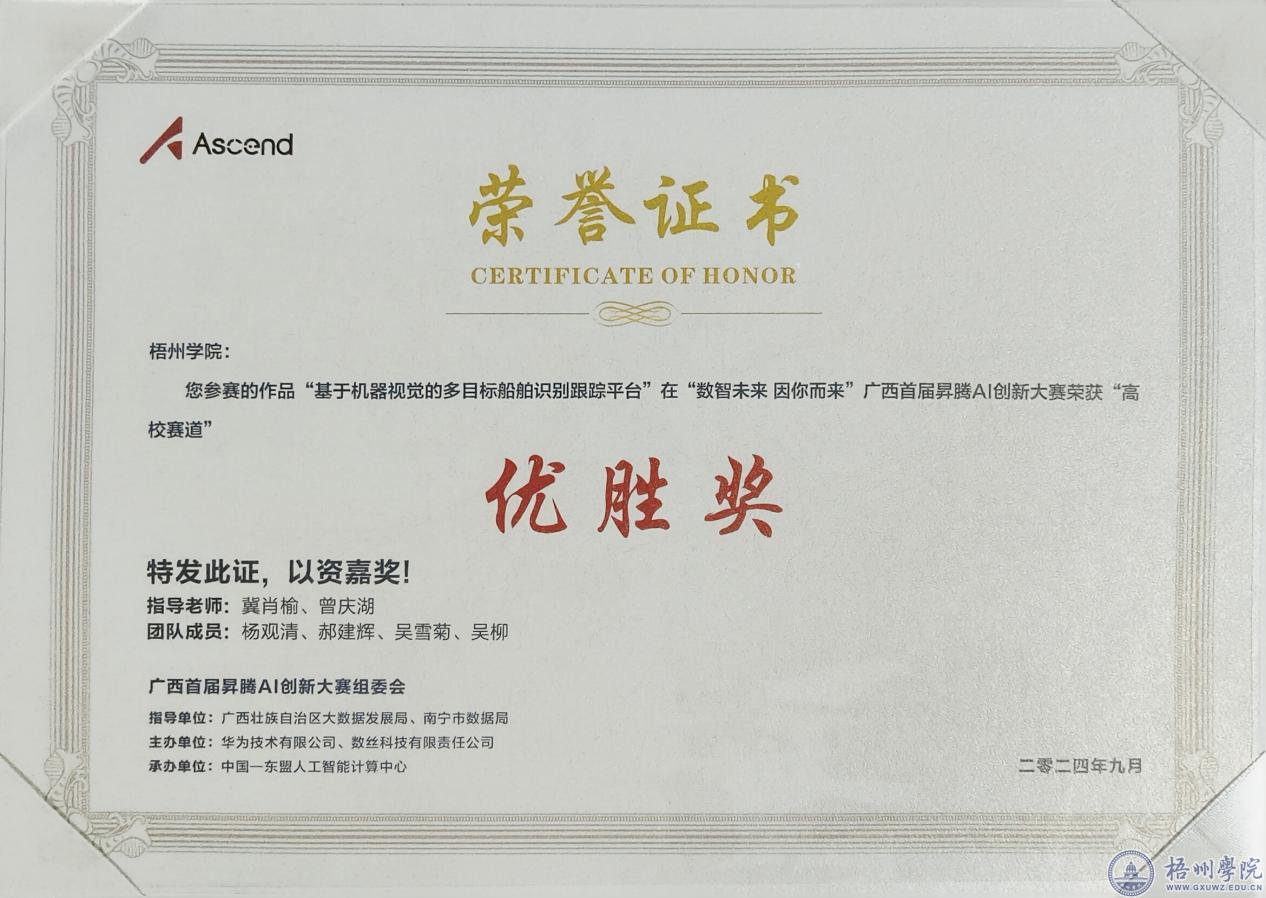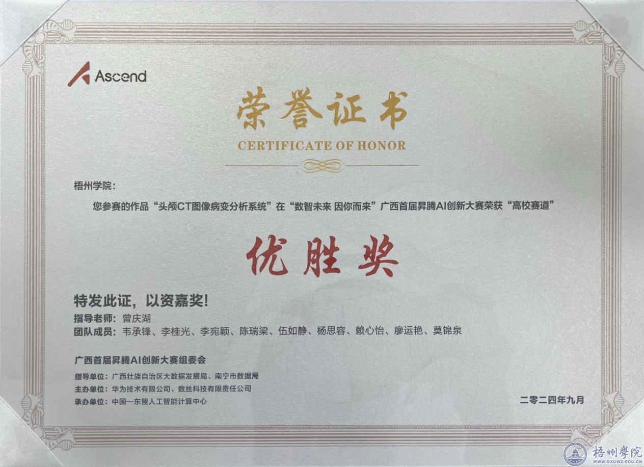 近日,广西首届昇腾AI创新大赛圆满结束。大数据与软件工程学院积极组织学生参赛荣获优胜奖。本次大赛由广西壮族自治区大数据发展局主办,旨在推动人工智能技术在各领域的创新应用,促进数字经济与实体经济的深度融合。