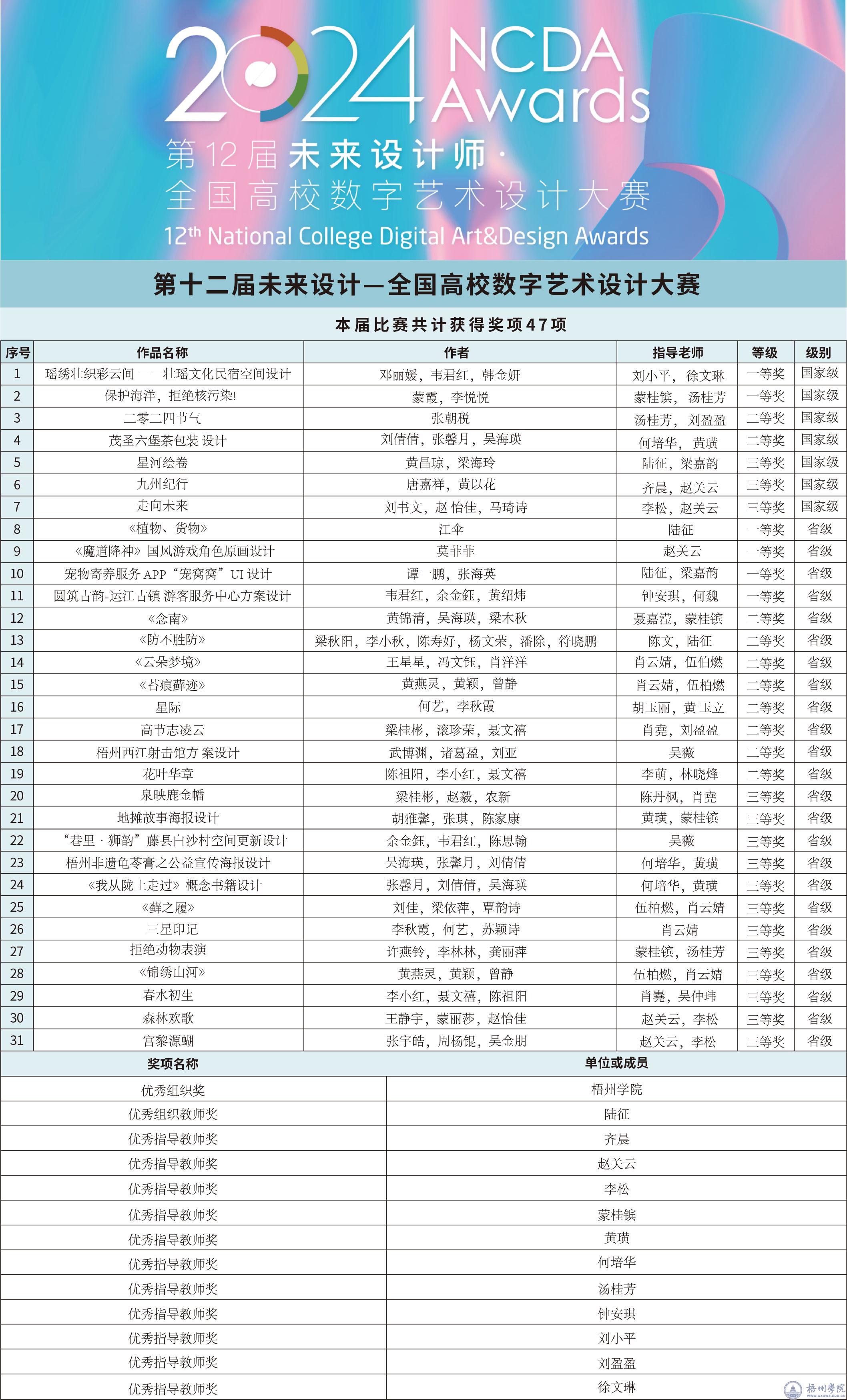 2024年9月,第十二届未来设计师全国高校数字艺术设计大赛顺利落下帷幕。我校获得优秀组织奖。据悉本届大赛共有1891所高校参赛,共收到298,763件作品,设立29个省级赛区。