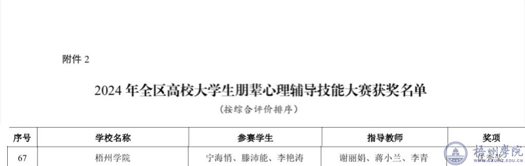 近日,根据《自治区教育厅关于公布2024年全区高校大学生“3·25”心理健康教育活动季活动获奖名单的通知》,我校选送的参赛作品《协同合力,转危为安——抑郁学生复发危机情境心理干预报告》荣获2024年全区高校大学生心理健康教育典型案例三等奖;我校选派的学生参赛队伍荣获2024年全区高校大学生朋辈心理辅导技能大赛优秀奖。