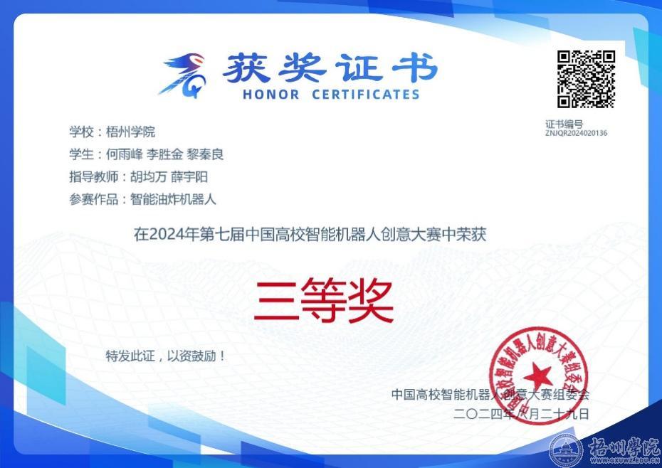近日,由中国高等教育学会、教育部工程图学课程教学指导委员会、中国高校智能机器人创意大赛组委会共同主办的中国高校智能机器人创意大赛正式落幕。我校机器人工程专业学生何雨峰、李胜金、黎秦良同学脱颖而出,获得第七届中国高校智能机器人创意大赛全国三等奖的优异成绩。