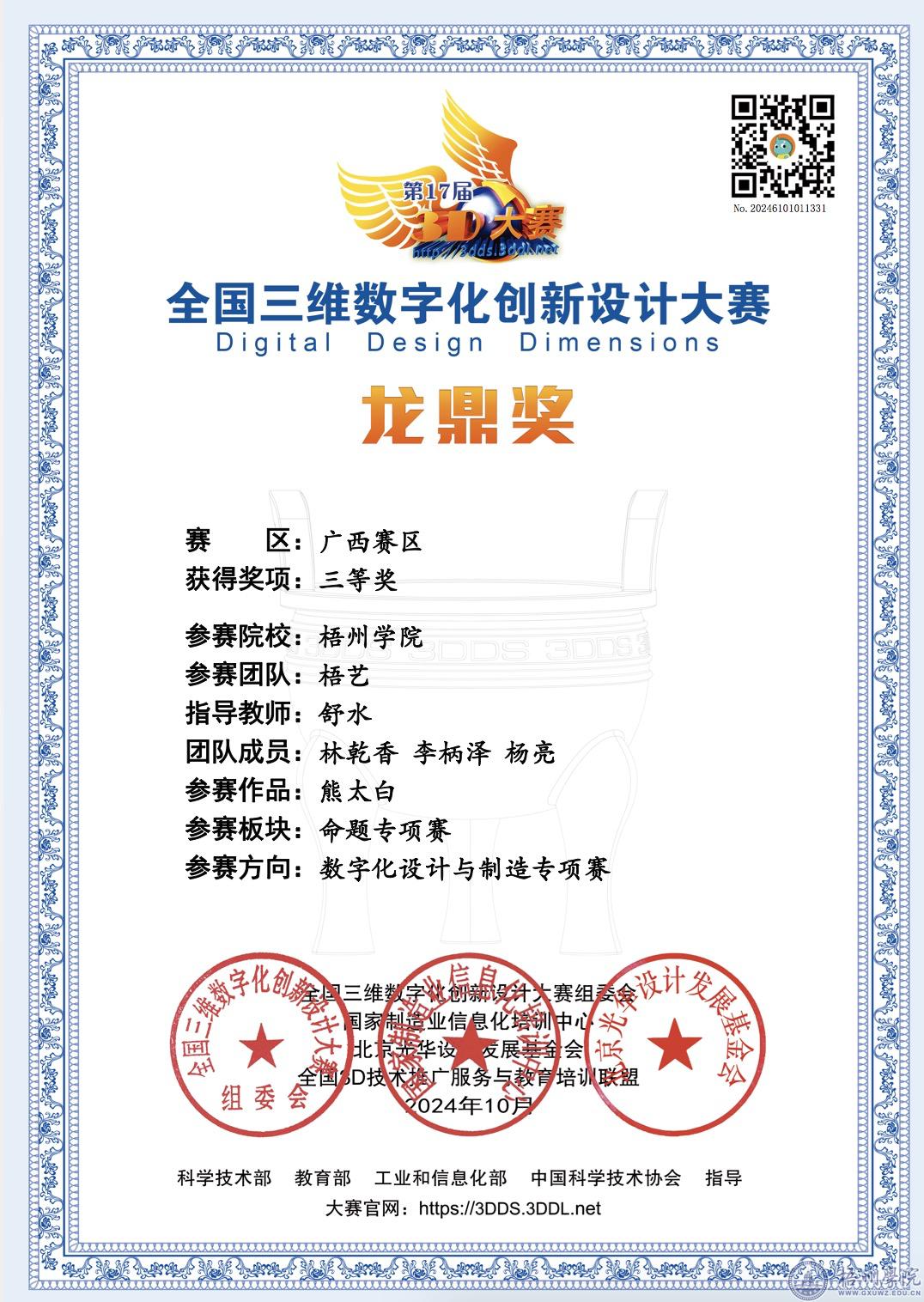 10月15日,2024第17届全国3D大赛数字化设计与制作专项赛广西赛区评审结果公布,宝石与艺术设计学院22级数字媒体艺术专业学生林乾香、李柄泽、杨亮团队获得广西赛区三等奖。