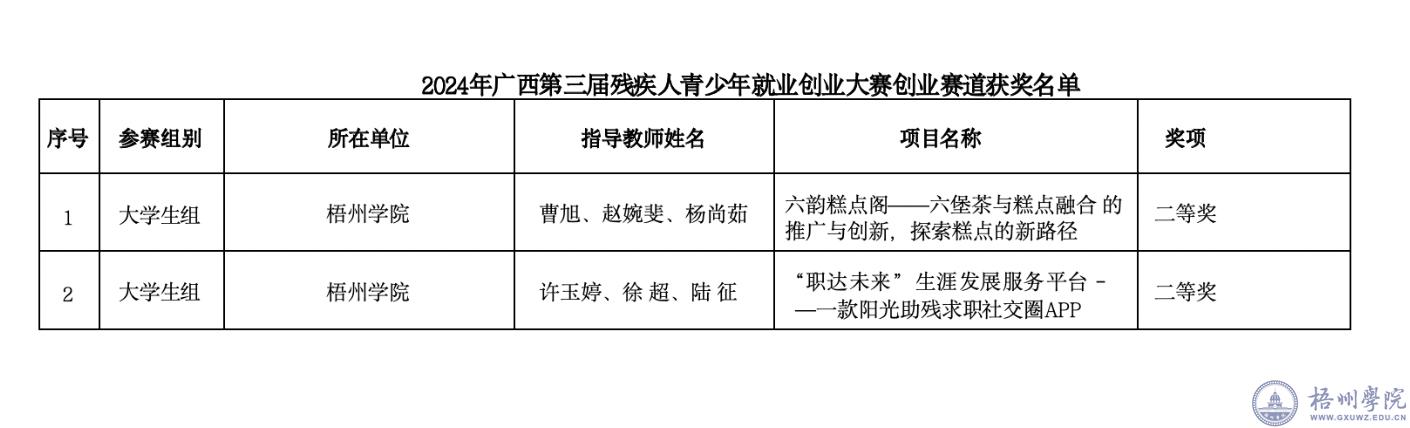 近日,2024年广西第三届残疾人青少年就业创业大赛落下帷幕,我校选派的两支参赛队伍均获得广西第三届残疾人青少年就业创业大赛创业赛道大学生组二等奖。