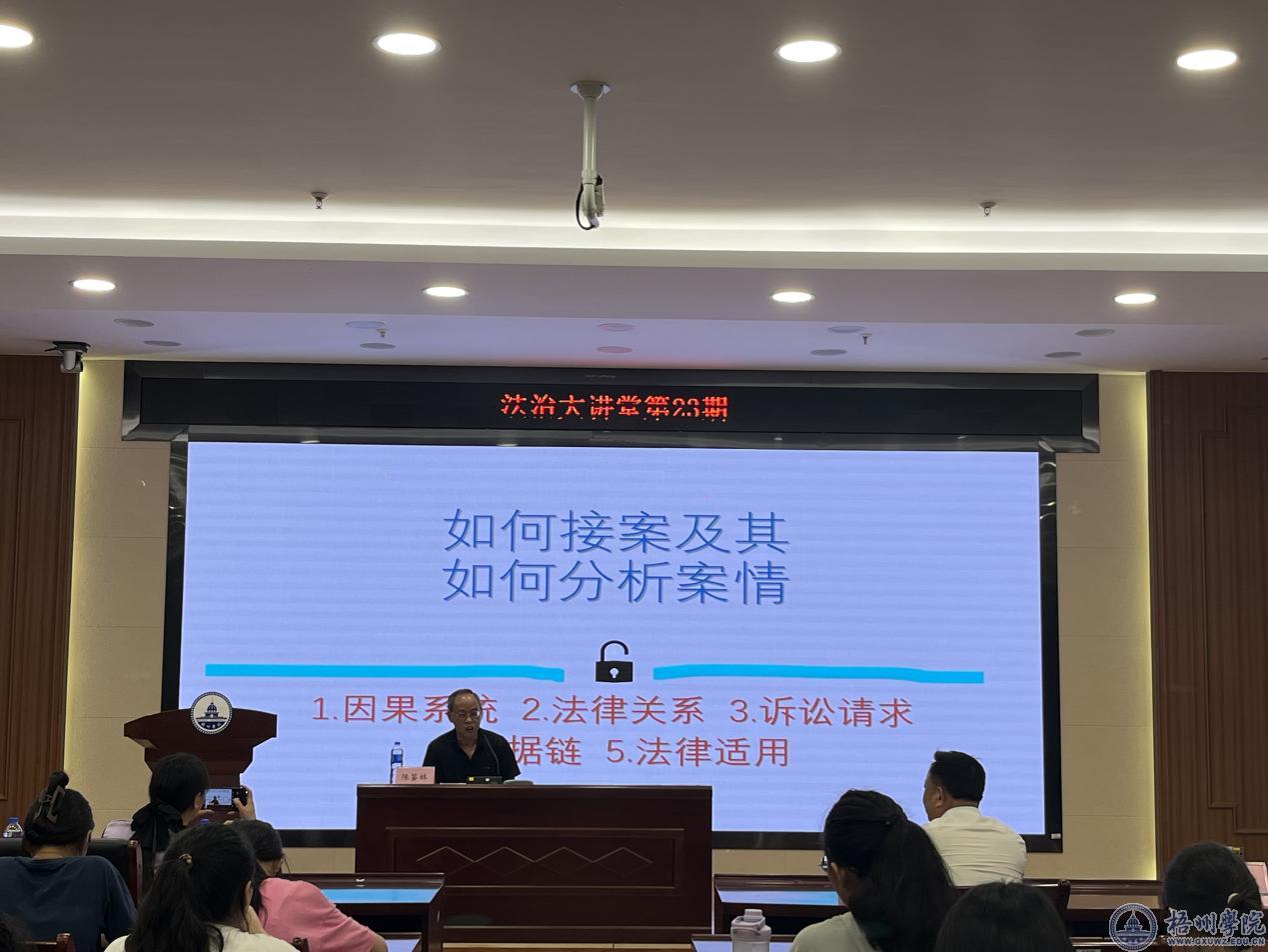 为进一步提高法学院学生的实践能力和专业素养,把应用型法治人才的培养落到实处。6月13日下午法学院在明科楼学术报告厅举行了“法治大讲堂”系列讲座第23讲,邀请广西公力律师事务所主任陈鉴林律师为法学院22级和23级部分学生作《如何接案及其如何分析案情》的专题讲座。