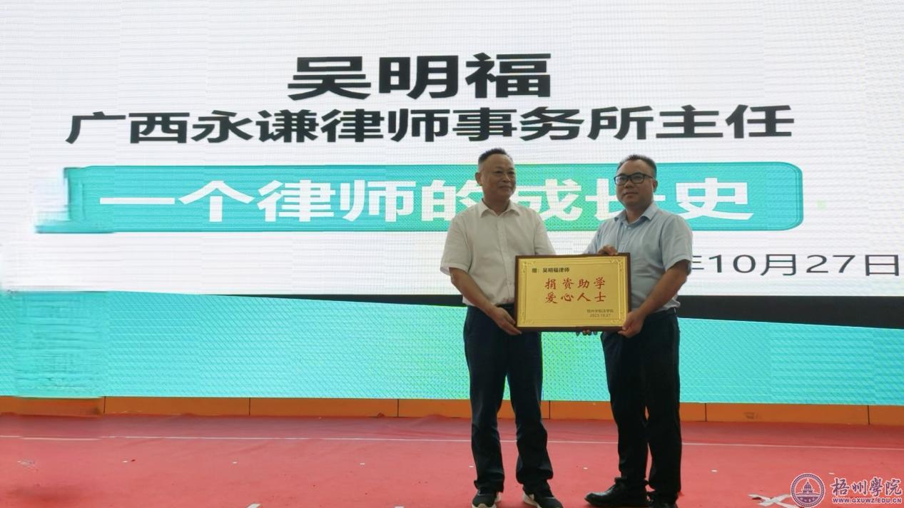讲座开始前骆庆国院长为吴明福律师颁发了“捐资助学 爱心人士”的牌匾。
