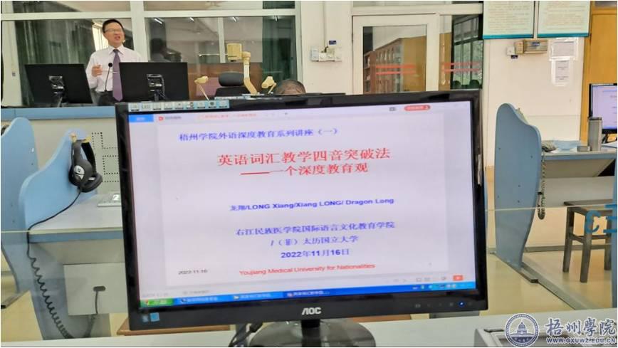 11月16日下午,外国语学院在实验楼语音室四举办了英语词汇教学四音突破法:一个深度教育观讲座。报告由右江民族医学院国际语言文化教育学院龙翔教授主讲,外国语学院全体教师到场聆听。