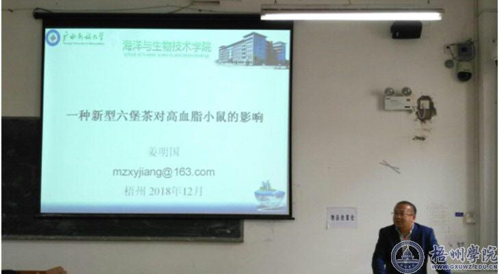 会上,广西民族大学姜明国博士教授给大家作题为“一种新型六堡茶对高血脂小鼠的影响”的专题报告。报告主要从“研究内容;经济和社会效益;发酵液对高血脂小鼠体重、肝重、肝脏系数的影响;国内外合作与交流”等方面进行介绍。