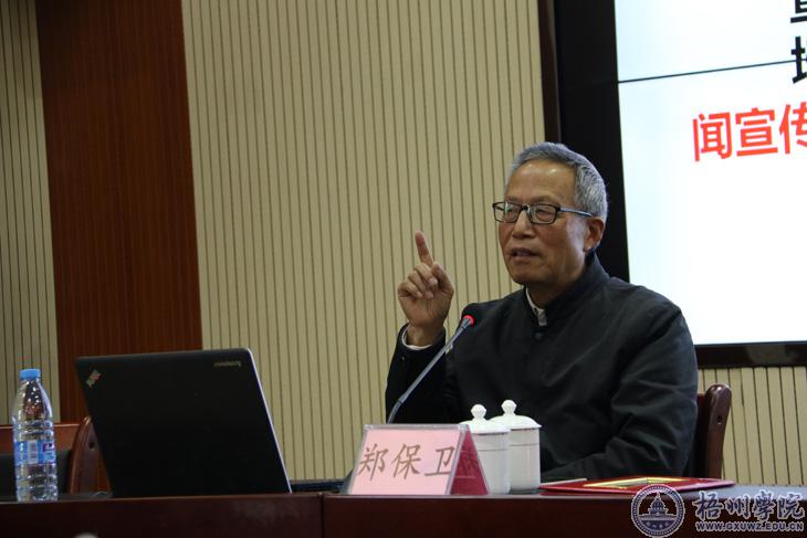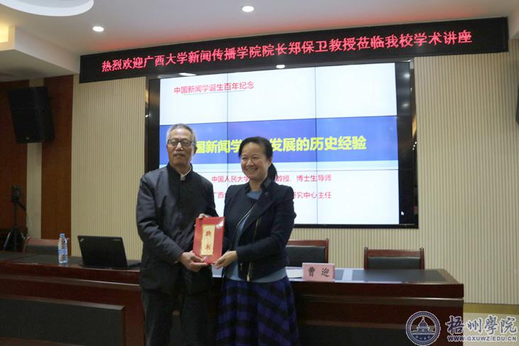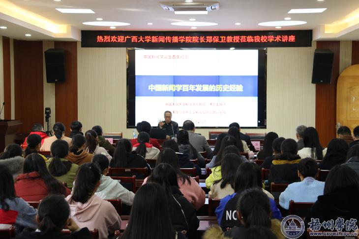 12月18日下午,学校邀请中国人民大学新闻学院博士生导师、教育部国家研究基地中国人民大学新闻与社会发展研究中心主任,马克思主义理论研究和建设工程新闻传播学科首席专家、广西大学新闻与传播学院院长郑保卫教授到校,在明理楼视频会议室为师生作了“中国新闻学百年发展及其历史经验”讲座。学校党委副书记曹迎,梧州市外宣办主任杨浩,学校党委宣传部、文传学院新闻学教研室教师和学生,梧州市主流媒体记者参加了讲座。曹迎副书记主持讲座。