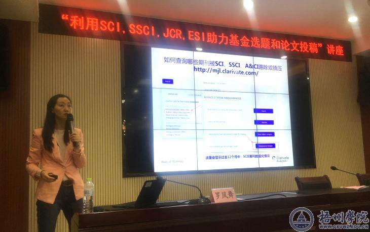12月21日,科睿唯安(Clarivate Analytics,原汤森路透)大学与政府事业部大区高级业务经理罗凤舞女士应邀到我校视频会议室作了一场题为《一流的科研信息,推动一流的学术研究——利用SCI,SSCI,JCR,ESI助力基金选题和投稿》的学术讲座。讲座由科研处副处长邓小林主持,学校各二级学院、各重点实验室、学科带头人和科研骨干近50余人听取了讲座。