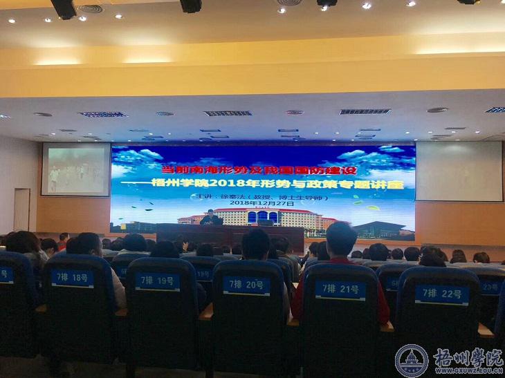 12月27日上午,广西大学马克思主义学院院长、博士生导师徐秦法教授在明理楼学术报告厅为我校师生开设了题为“当前南海形势及我国国防建设”的专题讲座,我校学生工作部(处)组织学生工作队伍和学生代表到场听取讲座。